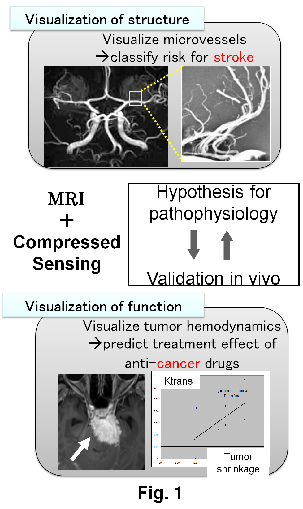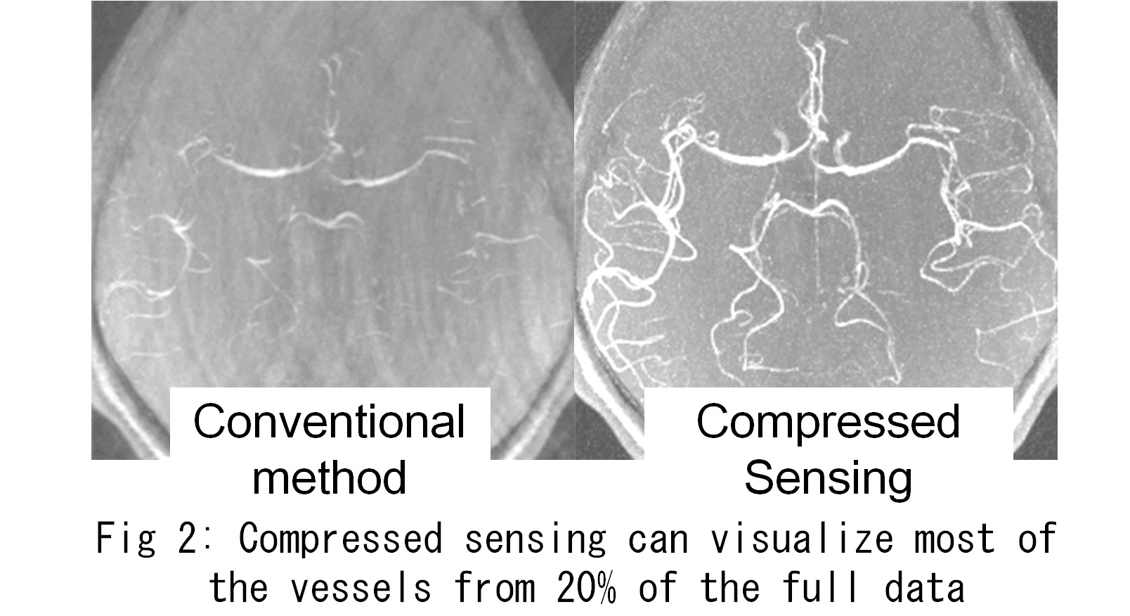 Through this initial experience, we have noticed that previously reported method to minimize residuals in compressed sensing does not yield visualization of microvessels of our interest. By combining the viewpoints of medical doctors and informatics scientists, we should be able to visualize fine structures of lesions (e.g., microvessels) and organ-specific characteristics (e.g., tissue perfusion). Promoting this project, not only in medical imaging but also in other natural sciences in collaboration with other teams, would cultivate a new area of science.